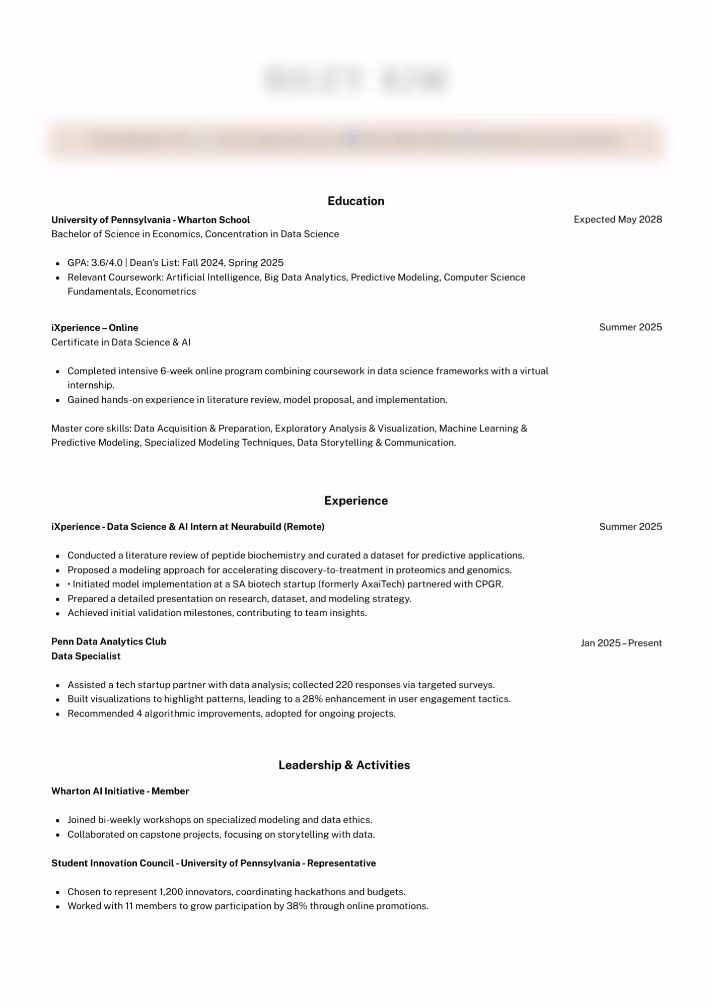 iXperience was an incredible and applicable learning opportunity for the career I want to pursue and allowed for my own personal and professional growth. Through my course curriculum I dove into exciting and relevant data science tools that even my university's data science major did not expose me to. Moreover, the accompanying internship and iX community provided me with industry experience and networking opportunities that will prove extremely valuable to me.